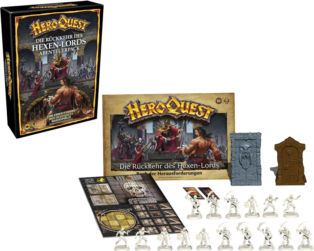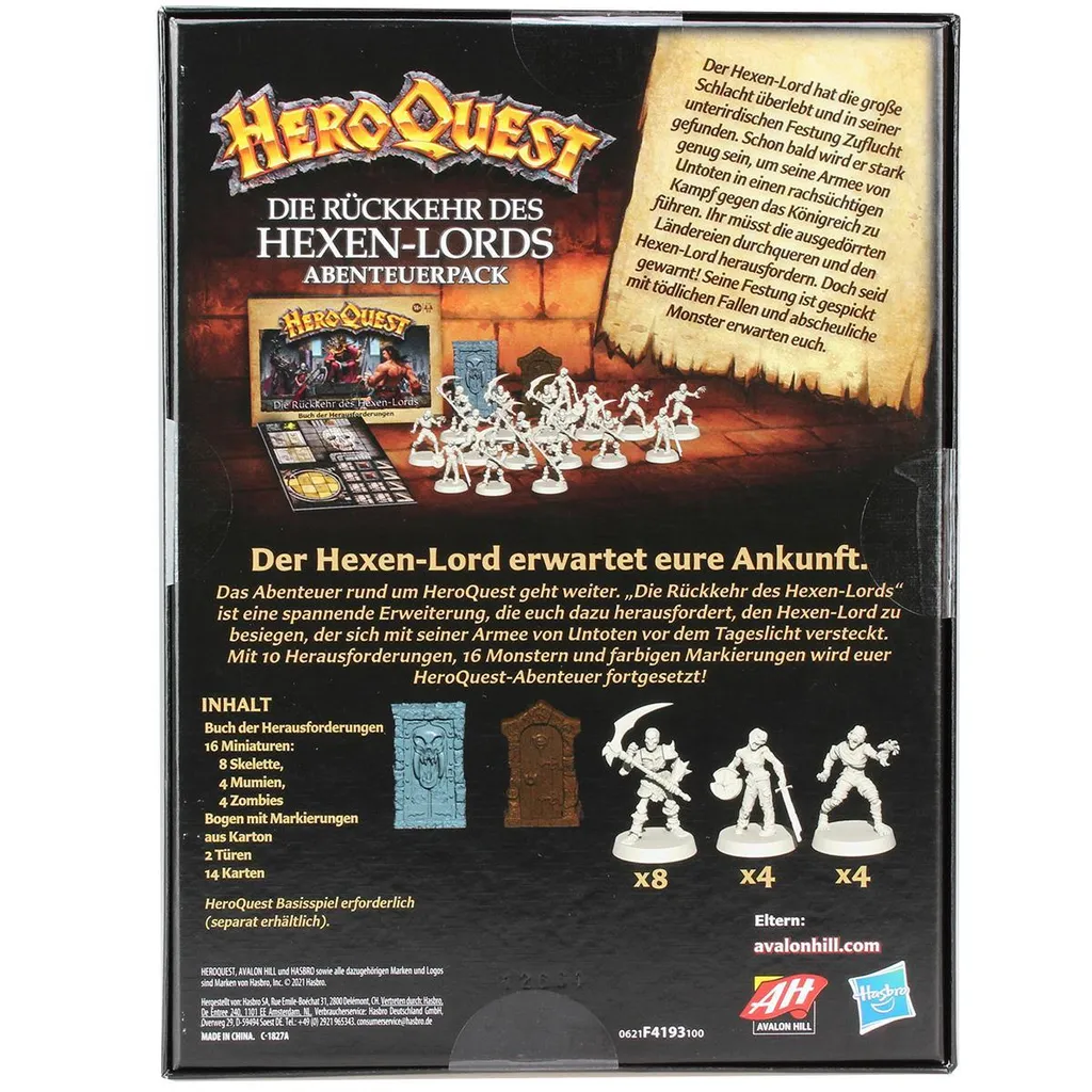 Das Abenteuer rund um HeroQuest geht weiter und lässt die Spieler noch tiefer in die Welt des beeindruckenden Fantasy-Spiels eintauchen. Bei der Erweiterung „Die Rückkehr des Hexen-Lords“ gilt es, an einem Strang zu ziehen und den Hexen-Lord zu bezwingen, der sich mit seiner Armee von Untoten vor dem Tageslicht versteckt. Der Pack enthält 16 detaillierte Miniaturen, farbige Markierungen und ein Buch der Herausforderungen mit 10 spannenden Abenteuern. Das Spiel ist unbegrenzt wiederholbar und dank einer leeren Karte können sogar eigene Abenteuer und Storys erfunden werden. Es eignet sich hervorragend, um Freunde zusammenzutrommeln und eine aufregende Nacht mit einem epischen Battle zwischen Gut und Böse zu erleben. Geeignet für 2 − 5 Spieler ab 14 Jahren. HeroQuest Basisspiel erforderlich (separat erhältlich). Avalon Hill sowie alle dazugehörigen Marken und Logos sind Marken von Hasbro, Inc. •ERWEITERUNG ZUM BASISSPIEL: „Die Rückkehr des Hexen-Lords“ ist eine spannende Erweiterung zum Avalon Hill HeroQuest Brettspiel. (HeroQuest Basisspiel erforderlich. Separat erhältlich.) •DAS ABENTEUER GEHT WEITER: Die Karten warten mit einem atemberaubenden Design auf, das die Fantasie der Spieler in eine mysteriöse Unterwelt voller Monster, tödlicher Fallen und mehr führt •NOCH MEHR MINIATUREN ZUM SAMMELN: Dieser Abenteuerpack enthält 16 detaillierte und unbemalte Miniaturen: 8 Skelette, 4 Mumien und 4 Zombies •ENTHÄLT 10 SPANNENDE HERAUSFORDERUNGEN: „Die Rückkehr des Hexen-Lords“ enthält farbige Markierungen, Artefaktkarten und spannende Herausforderungen •IMMER WIEDER SPIELBAR: Diese Erweiterung bietet noch mehr Möglichkeiten, um noch tiefer in die Welt von HeroQuest einzutauchen, wobei die Spieler auch ihre eigenen Geschichten erfinden und eigene Abenteuer erschaffen können •Ab 14 Jahren geeignet •2 bis 5 Spieler •Enthält Buch der Herausforderungen, 16 Miniaturen (8 Skelette, 4 Mumien, 4 Zombies), Bogen mit Markierungen aus Karton, 2 Türen, 14 Karten und Spielanleitung. (HeroQuest Basisspiel erforderlich.)