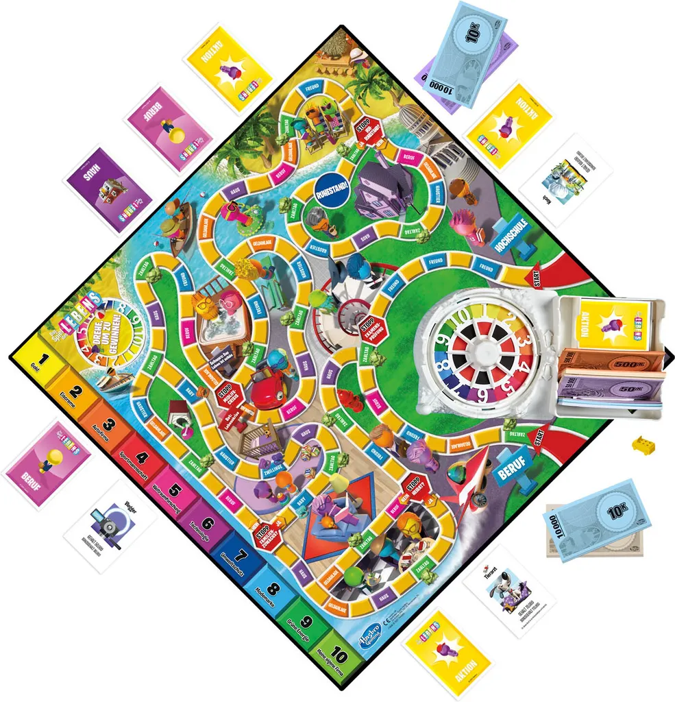 Dein Leben, dein Weg: welche Karriere schlägst du ein? Wie viele Kinder hast du? Durch Drehungen des Rades ziehst du nach vorn, Felder und Karten zeigen dir wie dein Leben verläuft.